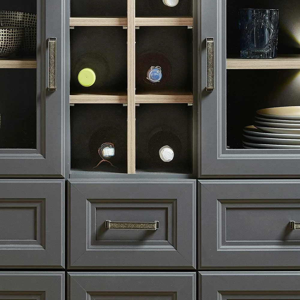 - Sechs offene Flaschenfächer befinden sich oben in der Mitte
