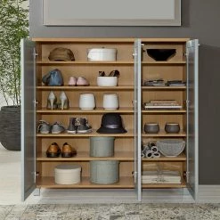 - Geräumiger Schuhschrank in Taupe und Eiche Bianco