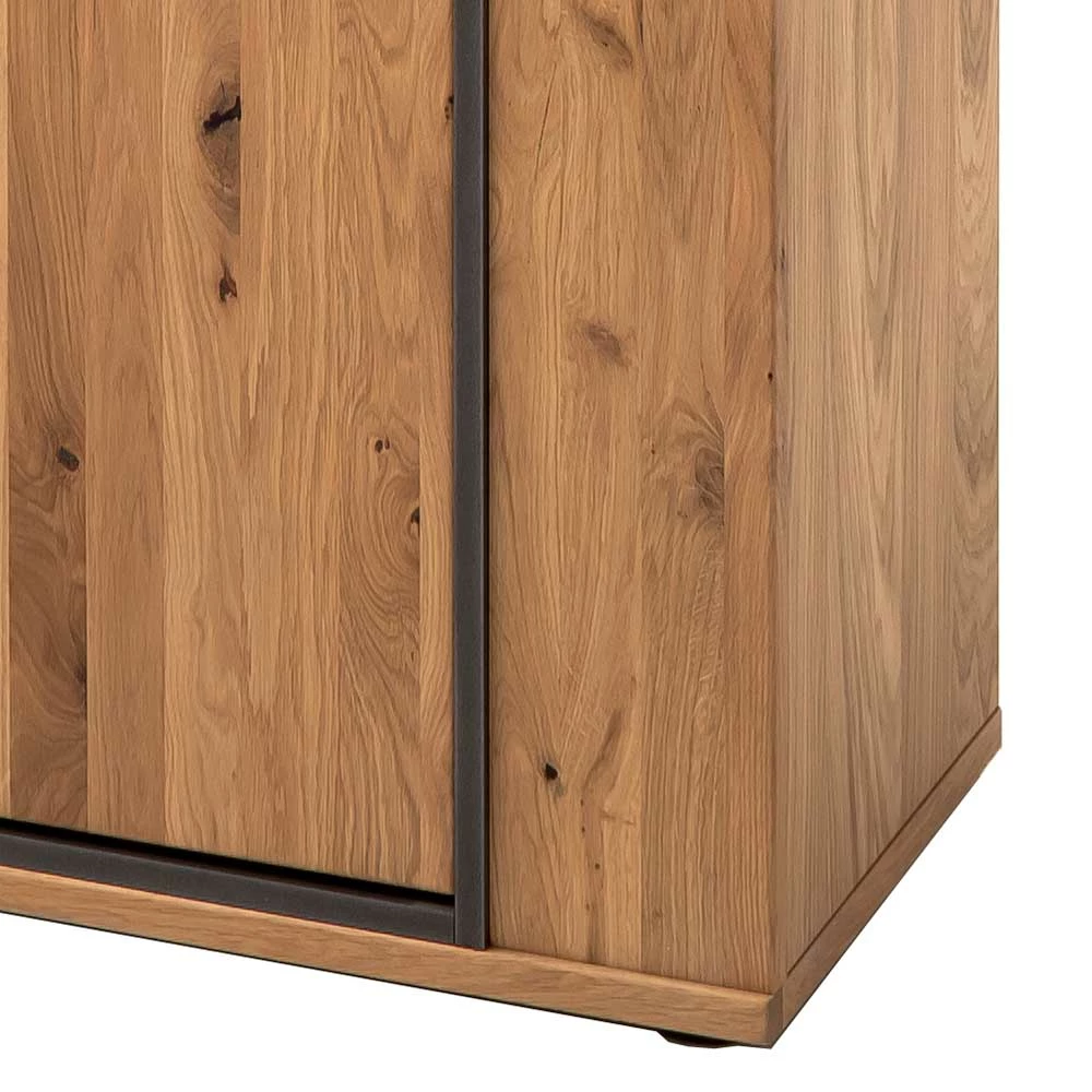 - Front Asteiche hell geölt, durchgehende Lamelle, Korpus außen mit Eiche Echtholz furniert und hell geölt, innen foliert in Holzoptik Eiche Bianco, Metall anthrazit pulverbeschichtet