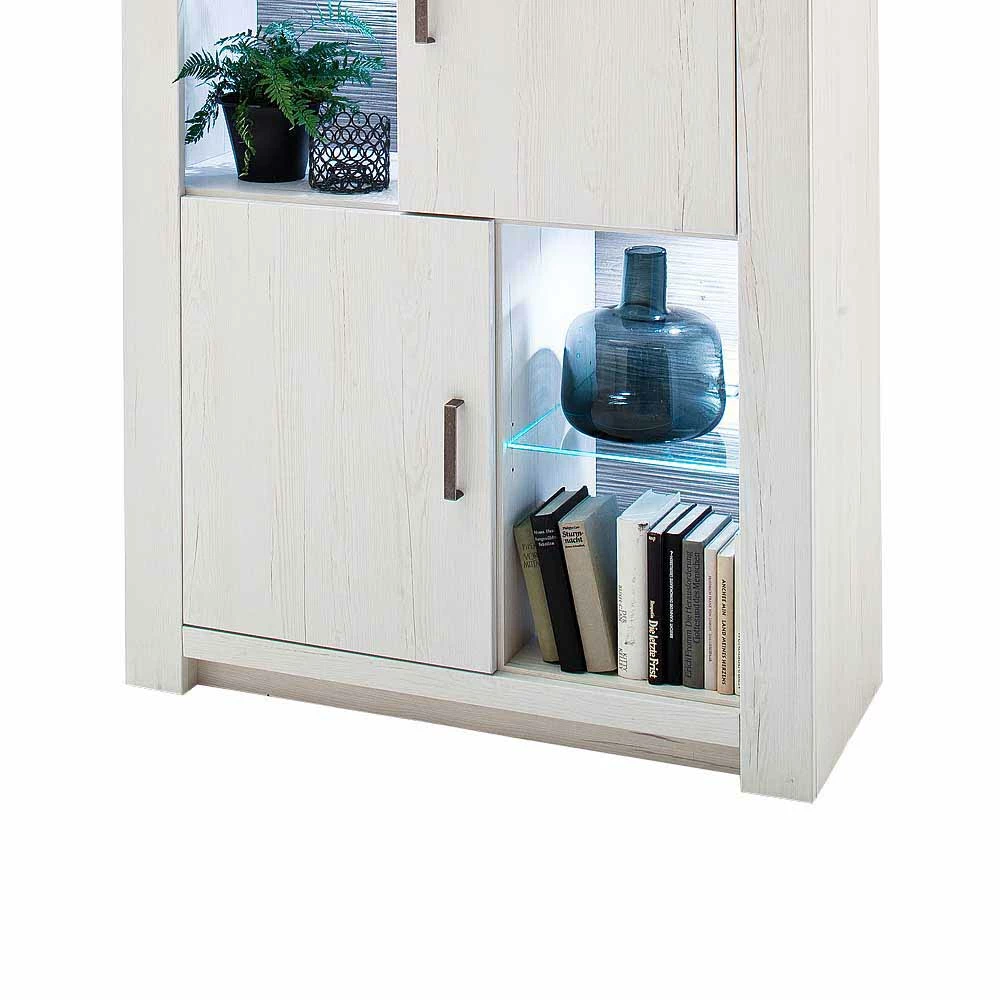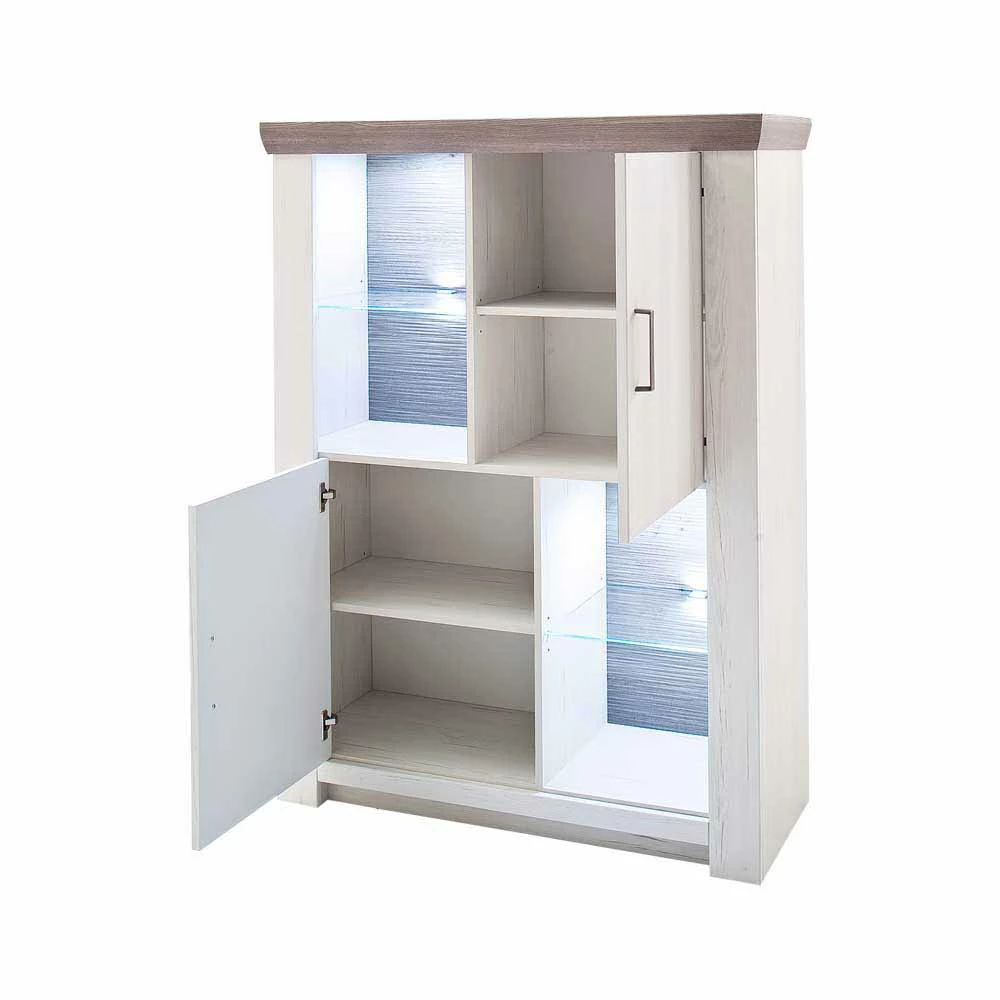- Oberfläche der Front foliert tiefgezogen in Holzoptik Pinie Weiß, Korpus und Einlegeboden melaminbeschichtet, Absetzung in Holzoptik Eiche Grau, sichtbare Rückwand in Eiche Grau 3D Optik foliert tiefgezogen
