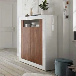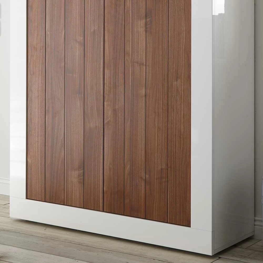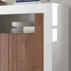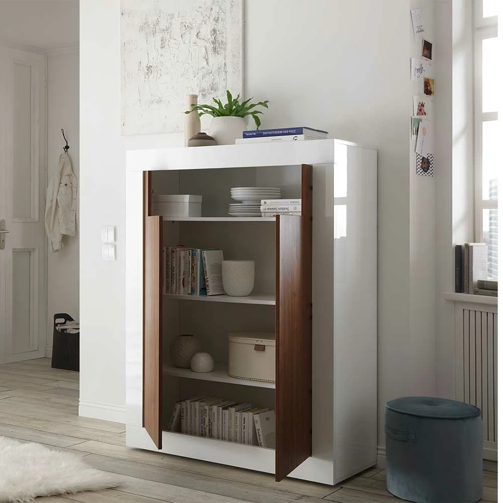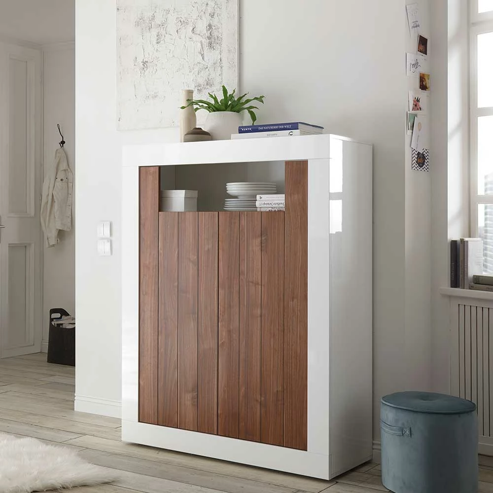 - Dekoratives Highboard in Weiß Hochglanz und Nussbaumfarben dunkel