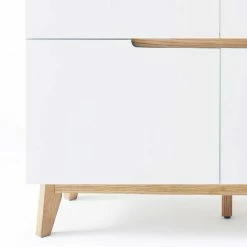 - Oberfläche matt weiß lackiert, Absetzungen mit Asteiche echtholzfurniert und geölt